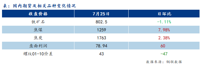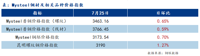 7月25日國內城市建筑鋼材價格延續漲勢,市場現貨價格普遍上漲20-60元/噸,市場交投氛圍活躍。具體來看,早盤期螺偏強震蕩運行,國內多數城市建筑鋼材價格小幅上漲,部分暫穩,淡季終端需求較為低迷,實際成交存在部分暗降出貨。午后期螺拉漲,焦煤期貨漲停,部分城市再次上調市場現貨價格,市場交投氛圍活躍。目前基本面矛盾尚不突出,焦炭第三輪提漲落地,原料端對成材價格有一定支撐,“反內卷”政策提振市場信心,短期現貨價格或仍有一定上漲空間。全國建筑鋼材成交量總計117258噸,日環比增加5.19%。
