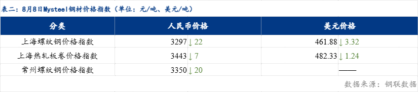 分地區(qū)方面,Mysteel上海螺紋鋼價(jià)格指數(shù)3297,跌22,常州螺紋鋼價(jià)格指數(shù)3350,跌20;上海熱軋板卷價(jià)格指數(shù)3443,跌7。(單位:元/噸)