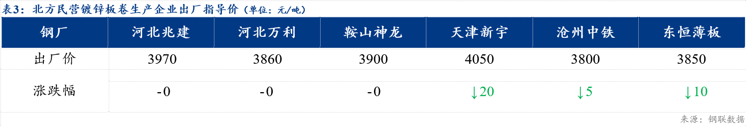 【鋼廠調(diào)價(jià)】今日各地區(qū)民營(yíng)鍍鋅鋼廠出廠價(jià)格部分下調(diào)10-20元/噸,北方資源出廠價(jià)在3860元/噸左右。