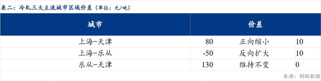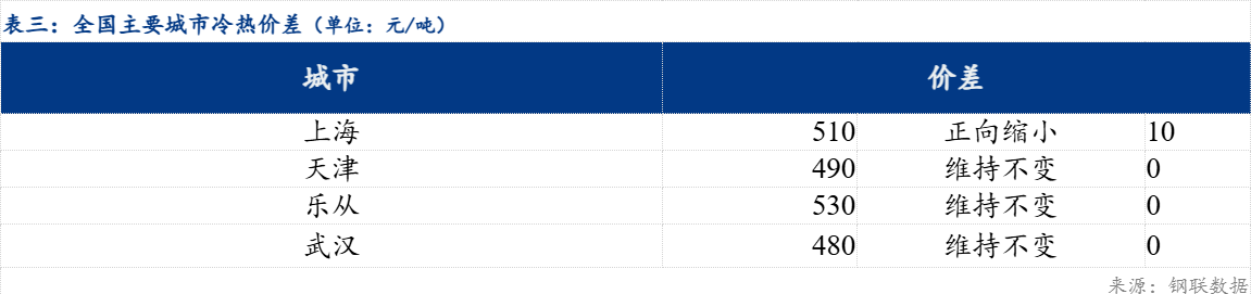 上海冷熱價差為510元/噸,天津冷熱價差為490元/噸,樂從冷熱價差為530元/噸,武漢冷熱價差為480元/噸。今日上海冷熱價差日環比收窄 10元/噸、天津冷熱價差日環比持平 、樂從冷熱價差日環比持平 、武漢冷熱價差日環比持平 。