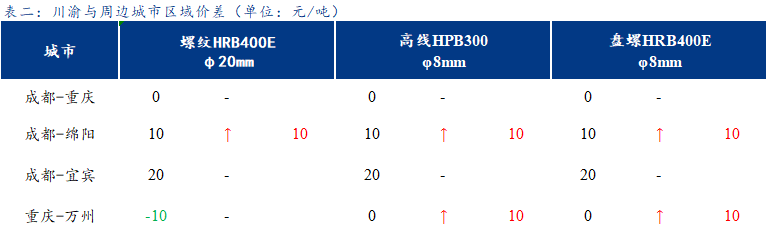 從區域價差來看,成都與綿陽、重慶與萬州價差繼續波動10元/噸,其他各區域價差維持穩定。
